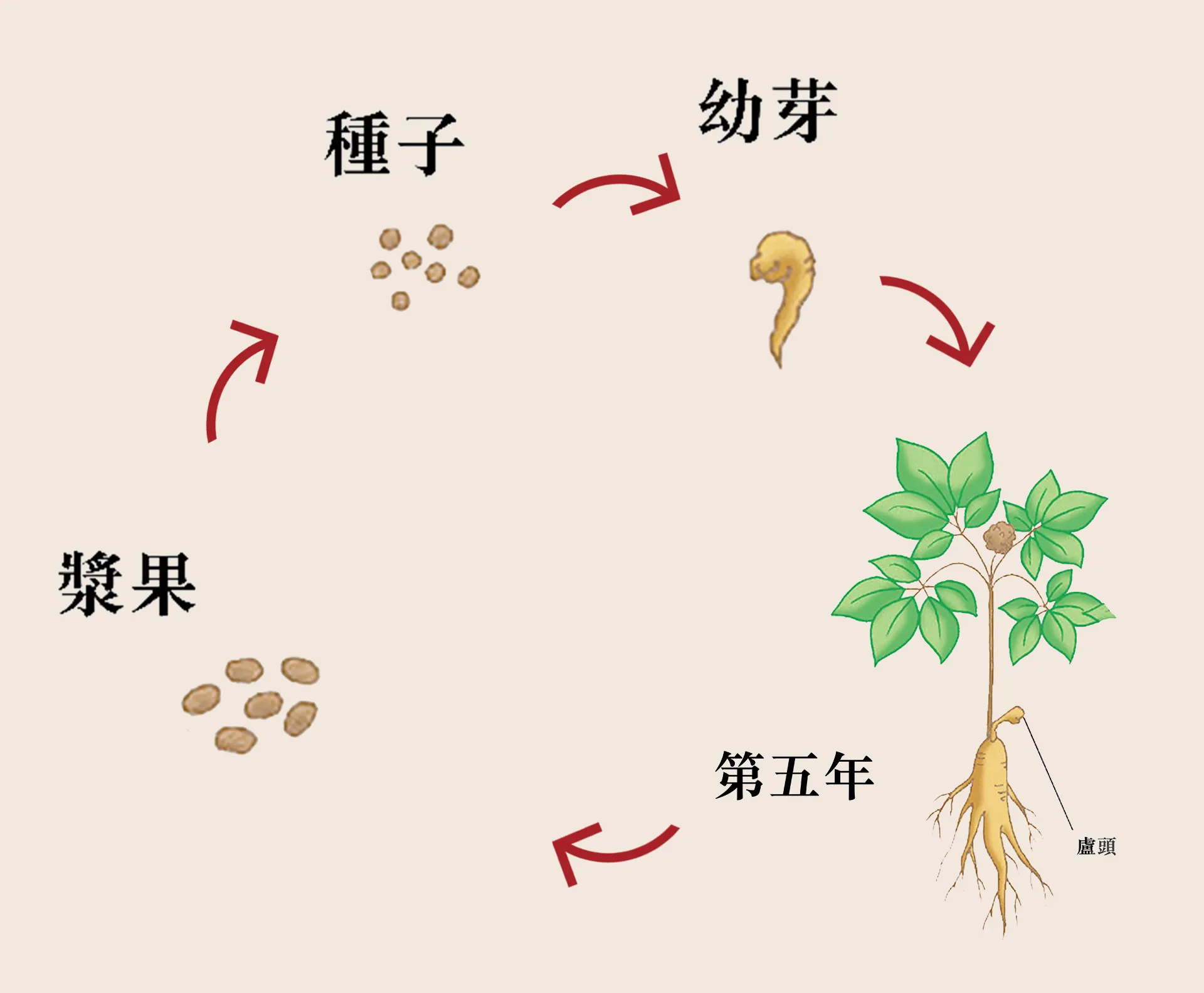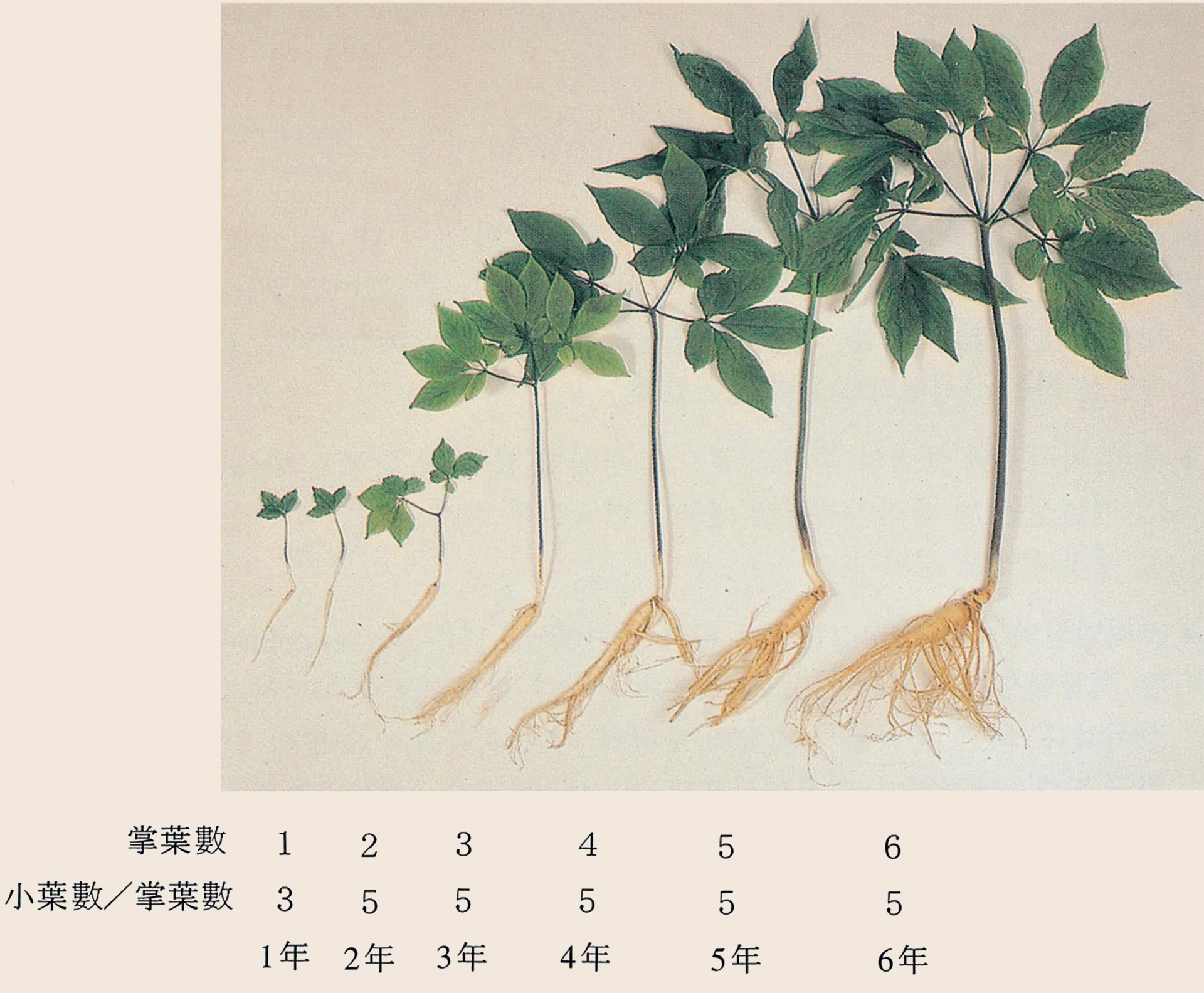 The number of palmately compound leaves on a ginseng plant differs depending on the plant’s age. Broadly speaking: 1-year-old ginseng plants have 1 leaf, 2-year-old ginseng plants have 2 leaves, 3-year-old ginseng plants have 3 leaves, 4-year-old ginseng plants have 4 leaves, 5-year-old ginseng plants have 5 leaves, 6-year-old ginseng plants have 6 leaves.