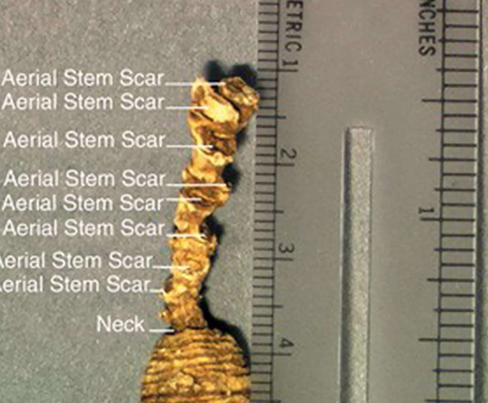The stem base or “crown” of wild American ginseng plants actually holds clues to the plant’s age. Each autumn, when the leaves fall off, a scar or ring forms on the ginseng crown.