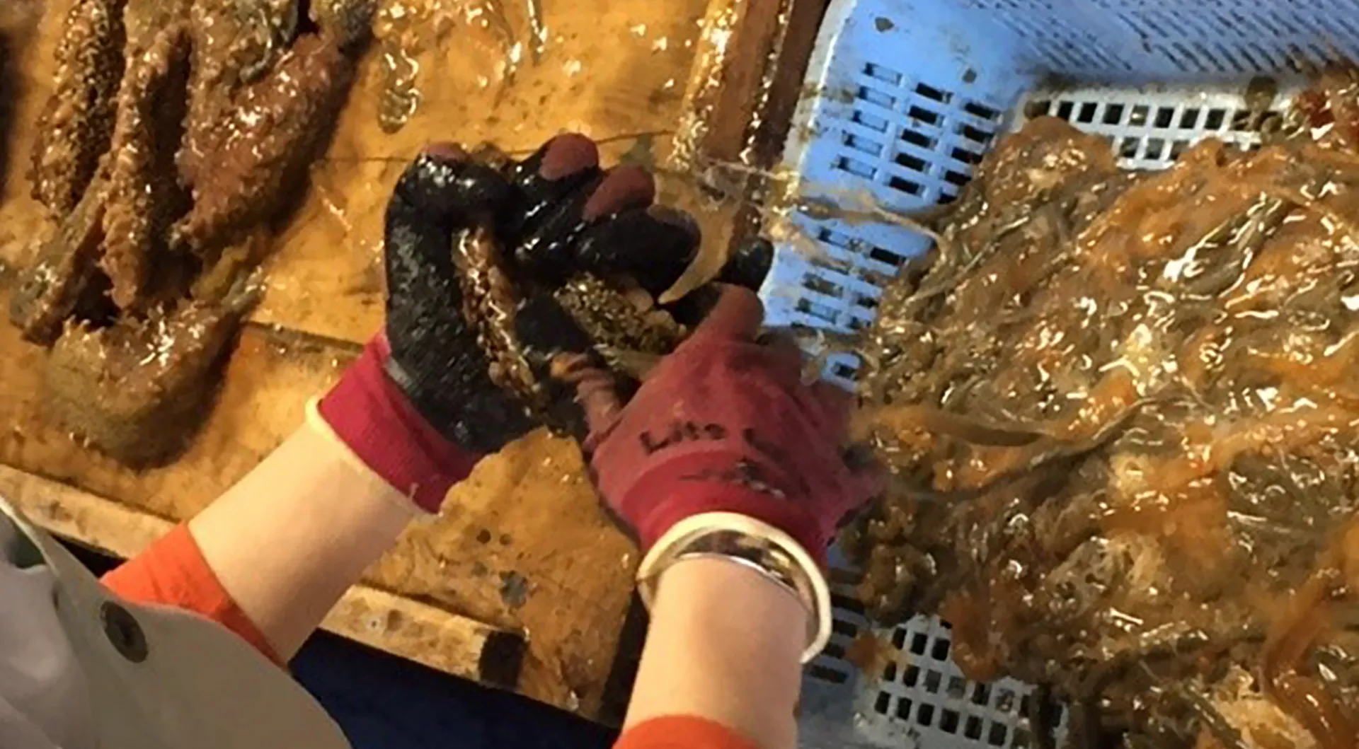 Workers use a knife to remove internal organs from the abdomen of the sea cucumber, and then wash the sea cucumber with water.