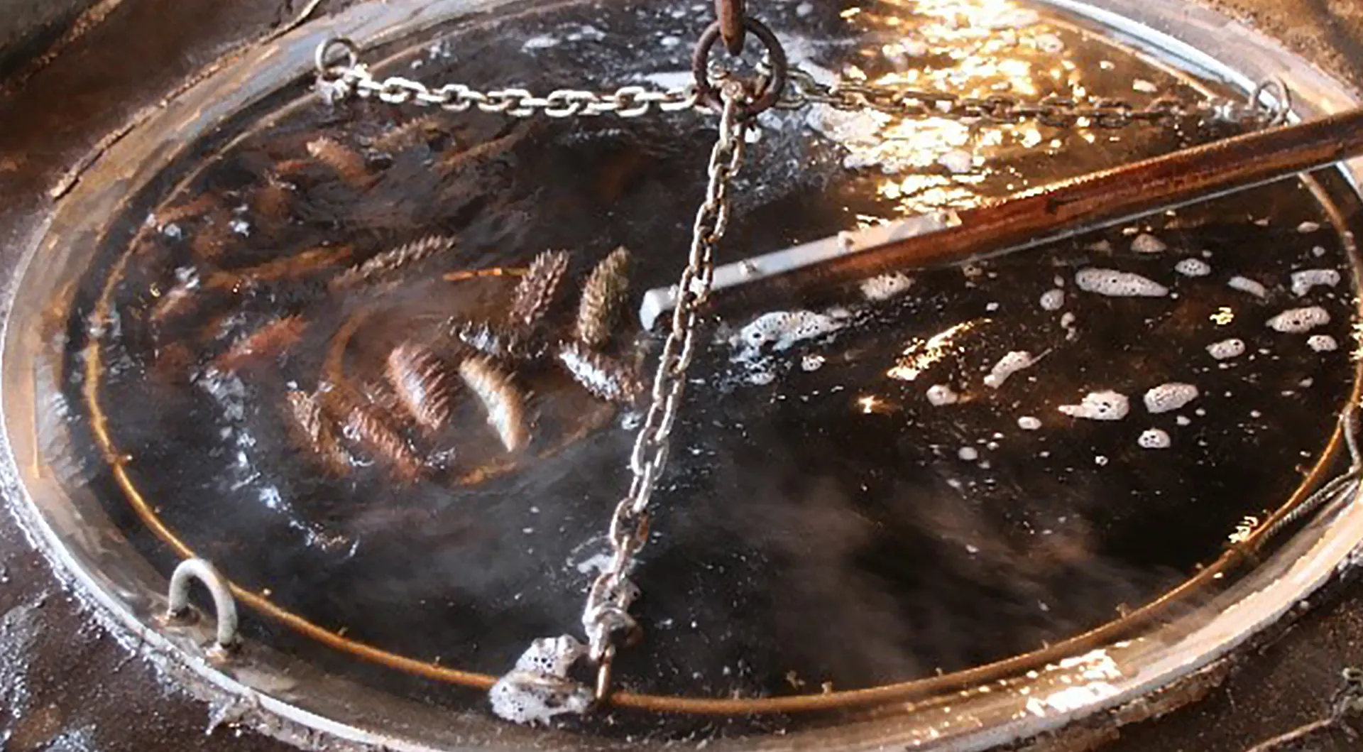 The dried sea cucumber is boiled in a pot, and in Japan, processing plants that have been doing so for generations have been cooking in a traditional iron pot to ensure an even temperature.