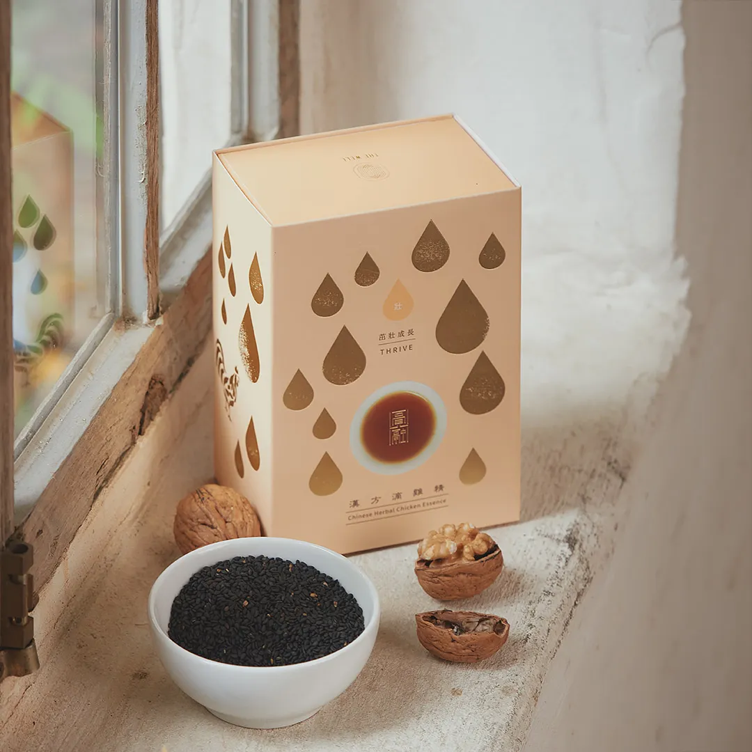 Herbal Chicken Essence “Thrive” is specially formulated for the healthy growth of children. It features the use of red-feather chicken, known for its balanced nourishing properties, along with the inclusion of Hairy Uraria, an ancient Chinese ingredient that targets children’s digestive health. This essence is further enriched with walnuts and sesame, which contribute to strengthening the spleen, supporting digestion, and promoting brain development. The red-feather chickens used in this product are raised in the mountains of Taiwan, ensuring a clean and natural environment. The essence undergoes thorough cleaning and is meticulously drip-sealed at high temperatures for 15 hours, resulting in a flavorful essence that appeals to children. The product has undergone testing and has been certified safe for consumption by German and Taiwanese inspection authorities.