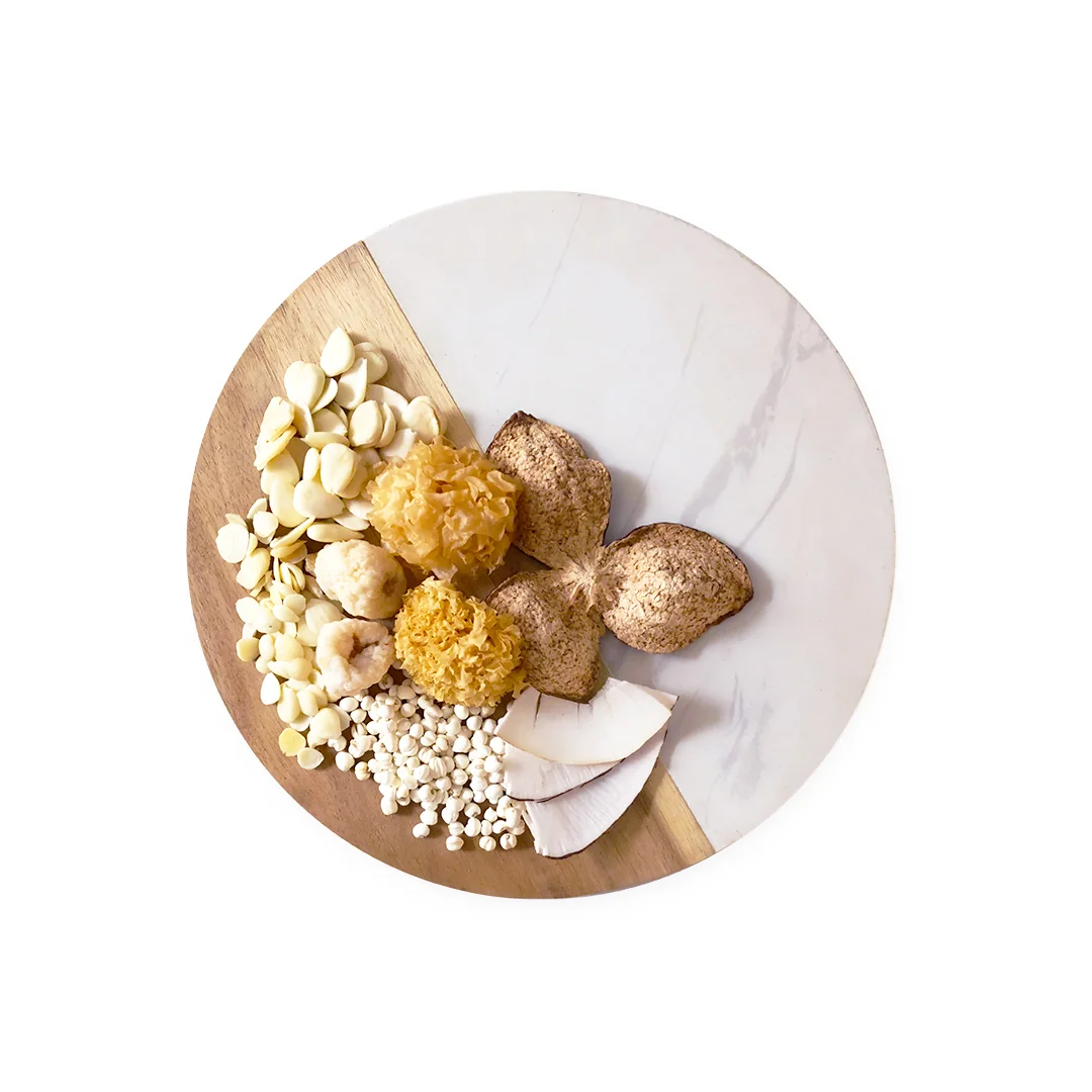 For winter coughs with sticky phlegm and labored breathing. Snow fungus & sea coconut moisten airways; chuanbei dissolves mucus; apricot kernels ease wheezing. Synergizes to clear phlegm, soothe lungs, and promote smooth breathing.